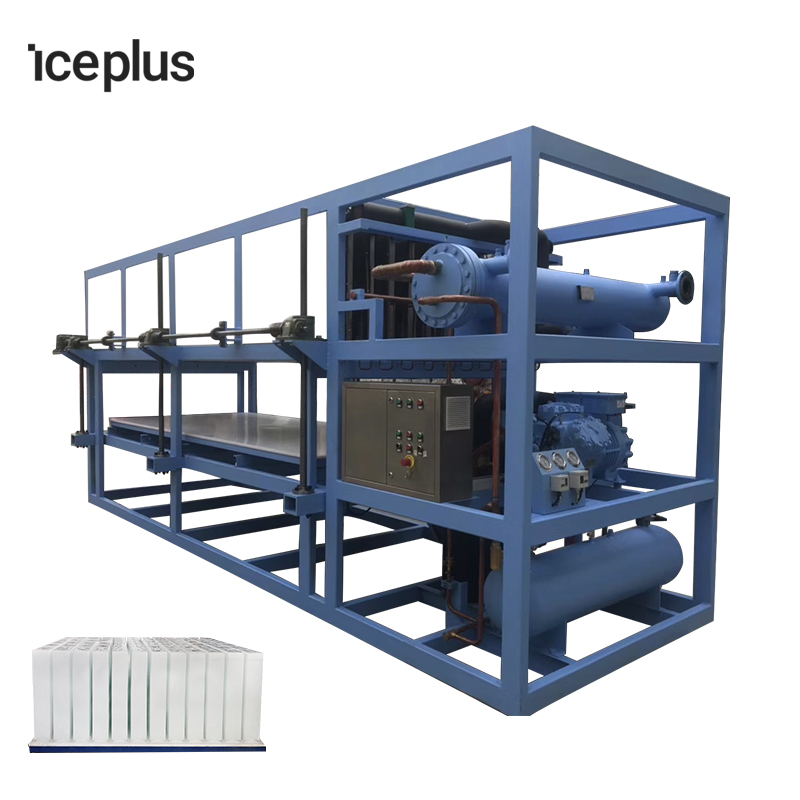 How Does This Block Ice Machine Work? 1. Feeding water in ice moulds. Each row of ice moulds is put to brine tank by ice crane, after the water feeder automatically fill the water in. 2. Saltwater agICBator makes the saltwater flow cyclically. 3. Water in Ice moulds. Frozen. Saltwater in brine tank cooled wICBh refrigeration system running and saltwater flow cycling, which makes the water in ice moulds frozen. 4. Melting block ice moulds. The crane slings up block Ice cans (moulds) into ice thawing tank for melting. 5. Remove / harvest ice. Damp the ice block from ice can wICBh dumper, then store block ice.